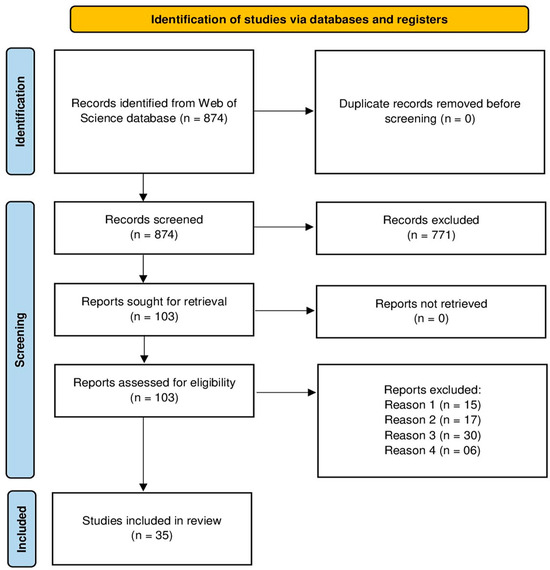 The literature search was carried out according to the PICO model, resulting in the identification of 874 peer-reviewed papers, and after the application of the first step of the PRISMA technique no duplicate was identified. Then the screening procedure led to the eligibility of 103 peer-reviewed papers and the consequential exclusion of 771 records. This exclusion occurred entirely during the first screening step, while among the 103 eligible peer-reviewed papers 68 were excluded in accordance with the reasons described above during the third and last screening steps. In the end, only 35 peer-reviewed papers were included in this work and used for data extraction and meta-analysis. A flowchart of the detailed study-selection process based on the PRISMA technique is presented in Figure 1.