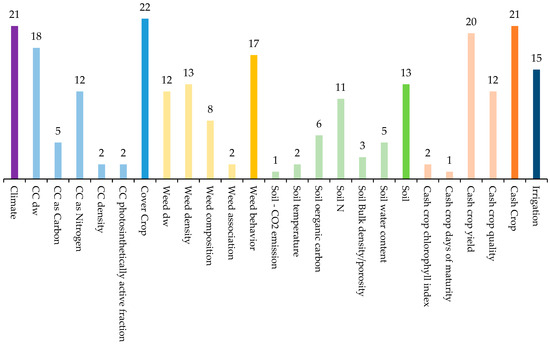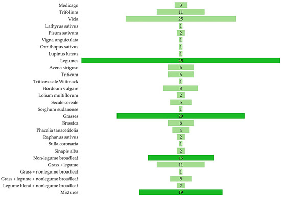 Figure 3 shows the list of the cover crop species and categories in the database. Cover crop types were categorized into legumes, grasses, non-legume broadleaves, and mixtures. Legume cover crops are the most frequently used species, and this can be justified because of their high capacity to fix atmospheric nitrogen [20]. Among all the species, hairy vetch is the most widely used, and according to [71], hairy vetch is a well-suited cover crop for the temperate climate of the Mediterranean environment. Moreover, hairy vetch is a frost-resistant species that produces a high amount of above-ground biomass and strongly reduces weed density and richness [51]. Grasses are used 29 times; indeed, plants of this genus gain high biomass that decomposes slowly, thus delivering large amounts of carbon directly into the root [30]. Among the grass CC species, barley (Hordeum vulgare L.) had the greatest frequency, and this can be justified by the high adaptability of barley to the Mediterranean climate. Brassica species had the greatest frequency among the non-legume broadleaf CC species, most probably because of the natural production of allelochemicals useful in weed and pest control [31]. Regarding mixtures, grasses and legumes are dominant, and vetch and barley is the most common mixture.