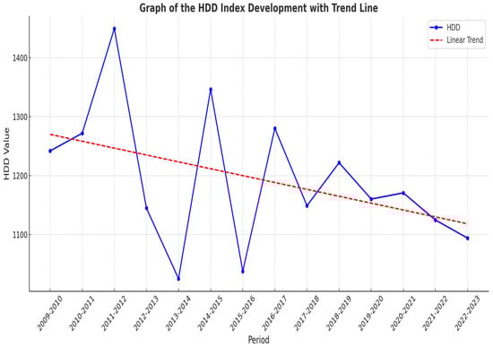 Table 2 shows different statistical characteristics of the HDD index based on the previous 14 winter periods, between 15 December and 15 April, for the years from 2009 to 2023. The average of each winter period is 1194.1 HDD, with a minimum 1025.1 HDD and a maximum 1449.7 HDD. Also significant are the median of 1165.45 and the standard deviation of 117.39.