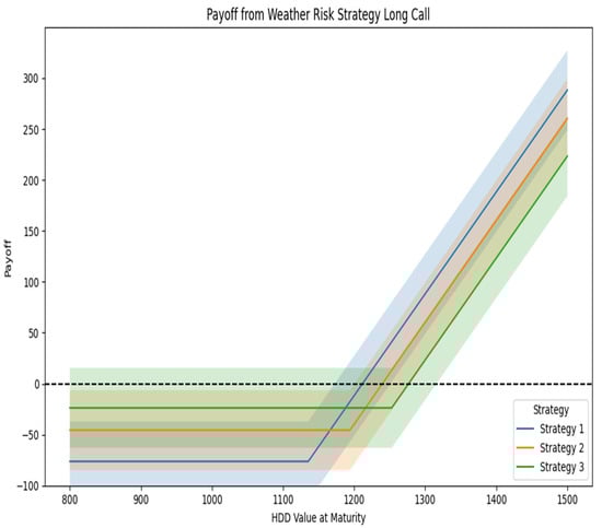 The application of various strike prices for Long Call and Straddle options strategies in HDD index is pivotal for providing flexibility based on farmers’ risk aversion. Higher strike prices in the Long Call strategy corresponded to lower premiums, offering a cost-effective option for low risk-averse farmers [31,56]. Conversely, lower strike prices offer higher payoff levels in extreme temperature conditions, suitable for farmers willing to invest more for increased income security. Furthermore, the application of the Straddle strategy can provide directionally independent protection in extreme high and low temperatures; this has also been explored in similar studies [2,14,31]. The adaptability of these strategies is crucial for managing diverse agricultural risks, enabling tailored financial solutions that align with varying weather patterns and farmer risk profiles, thereby enhancing the robustness and accessibility of weather derivatives in the agricultural finance.