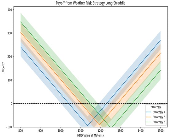 For the Long Straddle option, strategies 4, 5, and 6 were used with different strike prices K (Table 4). Long straddle strategy 4, with strike price 1135.44, is highly capable of protecting farmers from severe cold winters; it expects low temperatures by raising the threshold of HDD. Additionally, in strategy 4, warmer winter conditions are possible but are not as likely as colder conditions. This strategy is great for farmers who want to protect themselves from both cold and warmer winters, with an emphasis on extreme cold conditions. Conversely, Long Straddle strategy 6 is appropriate in conditions where extremely cold winters are possible but not highly likely, compared with warmer winters, where farmers expect lower temperatures during the winter. Strategy 5, with an intermediate strike price, is suitable for conditions of cold or warmer winters with an emphasis on their likelihood. In addition, each strategy presents a different premium for call (cL) or put (pL) options. The net payoff for each strategy equals the Long Straddle Payoff (LP) minus the combined premiums of the call (cL) and put (pL) options. These scenarios are detailed in Table 5.