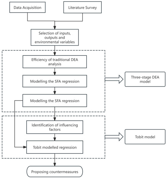 The conventional DEA model is founded on the premise of constant returns to scale, which restricts its capacity to precisely assess the efficiency of decision-making units that function under varying returns to scale. Moreover, it fails to consider the impact of environmental factors and unpredictable disruptions, which might undermine the precision of energy efficiency evaluations. To overcome these constraints, this study utilizes the three-stage DEA model introduced by Fried et al. [16] to accurately assess energy efficiency. The research employs the Tobit model to examine the factors that impact energy efficiency. The precise methods and processes are depicted in Figure 1.