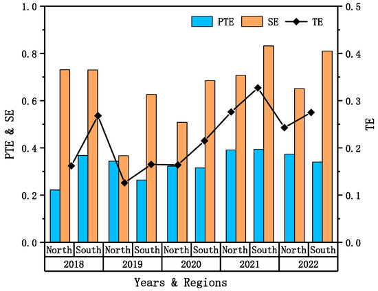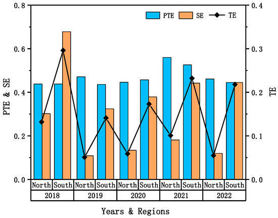 - According to Figure 2, the average energy efficiency of green low-carbon firms in the south is higher than that of green low-carbon firms in the north. The difference in pure technical efficiency between the two regions is minor, with both regions exhibiting relatively low levels overall. However, the scale efficiency of southern enterprises exceeds that of northern enterprises. Despite a minimum value of 0.626 in 2019, southern enterprises maintain a relatively stable development trajectory. In contrast, the scale efficiency of enterprises in the north reached 0.367 in 2019. The main reason for such a difference is that enterprises in the south are experiencing rapid economic development, with a better environmental terrain for their enterprises and with more abundant and sufficient resources, which means that they can afford to invest more capital shares in energy conservation, thus forming a more stable scale effect.