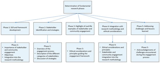 The figure provides a structured overview, beginning with the foundational phase of the SLR and framework development. During this phase, the authors highlight the significance of stakeholder and community engagement in hybrid PPAs, connected with the importance of stakeholder and community engagement and its role in driving sustainable energy transitions, articulate the objectives of the research, and integrate these components into the broader research methodology including data collection, analysis, and interpretation. This initial phase lays the groundwork for subsequent stages, informing the approach to stakeholder identification and engagement strategy planning (Phase 1).