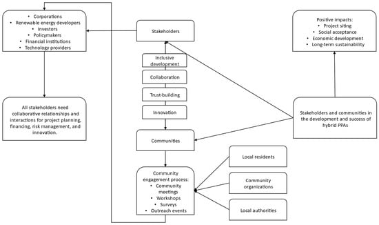 Figure 5 outlines a summary figure as a visual overview of the stakeholder and community engagement towards hybrid PPAs, to better unravel the complex relationships and dynamics involved in stakeholder and community engagement within the context of hybrid PPAs. Stakeholders in this context include corporations, renewable energy developers, investors, policymakers, financial institutions, and technology providers. These stakeholders require collaborative relationships and interactions for project planning, financing, risk management, and innovation, all of which are essential for the successful development and implementation of renewable energy projects. Key processes for stakeholders encompass inclusive development, collaboration, trust-building, and innovation. Inclusive development ensures that all relevant parties are involved in the project from the beginning. Collaboration involves working together to achieve common goals. Trust-building is crucial for developing mutual trust among stakeholders and communities, and innovation encourages new ideas and technologies to improve project outcomes.