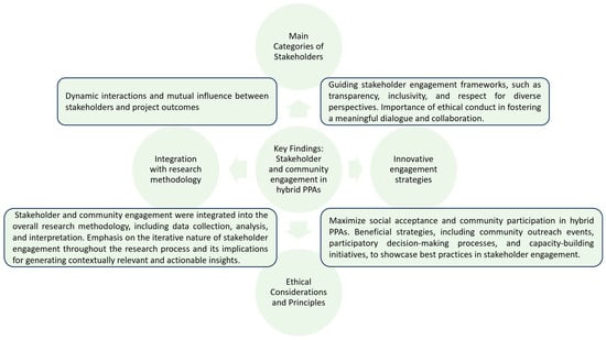 In brief, the results of the SLR provide valuable insights into the dynamics of stakeholder and community engagement in hybrid PPAs and their implications for sustainable energy transitions. By synthesizing existing research and identifying key trends and patterns, this study contributes to a deeper understanding of the complexities inherent in renewable energy project development. Moving forward, the findings underscore the importance of continued research and innovation in stakeholder engagement practices to address emerging challenges and seize opportunities for advancing the transition to a more sustainable energy future. Figure 6 illustrates the results of the SLR on stakeholder and community engagement in hybrid PPAs, encapsulating the main insights gleaned from this paper in a visually engaging and informative manner. At the center of the Figure 6 are the key findings on stakeholder and community engagement in hybrid PPAs, surrounded by four interconnected aspects.