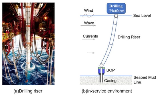 In deepwater drilling, the riser is the critical equipment that connects the drilling platform to the submarine wellhead. Unlike the embedded conduit commonly used in shallow water drilling, the riser system is more complex and is usually composed of dozens to hundreds of connected risers [1,2]. As shown in Figure 1, the bottom of the system is equipped with a blowout preventer, while the top is closely connected to the drilling platform through a chuck and tensioner. The riser operates in waters ranging from hundreds to thousands of meters deep, enduring alternating loads caused by waves, currents, and platform offsets while resisting seawater corrosion and uneven wear caused by drill pipes. The riser is prone to various defects such as cracks, corrosion, and wear during long-term service under such harsh conditions, making it a vulnerable component of the drilling system [3,4,5]. Once these defects cannot be detected promptly, they may lead to the rupture and failure of the drilling riser, which could result in a significant loss of drilling fluid and seriously hinder the progress of drilling operations. More seriously, this situation may also induce uncontrolled blowouts, causing severe pollution to the marine environment.