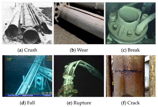 Numerous historical examples exist of such incidents [6,7,8,9,10]: In 1982, a semi-submersible drilling platform suffered a marine riser collapse accident in a 580 m deep sea area of the Gulf of Mexico, as shown in Figure 2a. In this accident, due to the massive leakage of drilling fluid, the bottom two sections of the drilling riser could not withstand the excessive external hydrostatic pressure and collapsed, resulting in significant economic losses and marine pollution. In 1999, during drilling operations conducted by BP at a depth of approximately 2200 m in the Gulf of Mexico, the main pipe above the flexible joint of the riser ruptured due to abrasion from the drill pipe, as shown in Figure 2b, which led to a substantial loss of drilling fluid, necessitating a forced shutdown for repairs. In 2003, BP’s Enterprise drilling vessel experienced excessive platform offset during operations at the Thunder Horse oil field, causing the high-speed rotating drill pipe to continuously wear down the inner wall of the marine riser, resulting in wall thickness reduction and ultimate rupture. This accident caused over 300 m of the marine riser to fall near the subsea wellhead, as shown in Figure 2c,d, leading to significant economic losses and severe pollution in the sea area. In 2010, the riser on Well DF1-1-14 in the Yinggehai Basin of the South China Sea developed a transverse crack of up to 48 cm in length, as shown in Figure 2f, resulting in a substantial loss of drilling fluid. This incident caused severe marine pollution and consumed significant labor hours for necessary repair work.