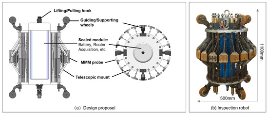 The proposed robot is designed to inspect external 21-inch (533 mm) diameter risers. The device is equipped with 20 arcuate probes arranged in an orderly circular fashion, where each probe is embedded with three susceptible giant magneto-resistive sensors. As illustrated in Figure 3, this circular array of 60 sensors enables a comprehensive overlapping scan of the pipeline’s inner wall, ensuring full coverage and high-precision inspection. The probes are ingeniously mounted on the robot’s main body and secured by a telescopic frame featuring three support rods and tension springs. Under the action of the tension springs, the probes can flexibly extend and retract, effectively adapting to the varying inner diameters of pipelines, thus guaranteeing flexibility and precision during the inspection process.