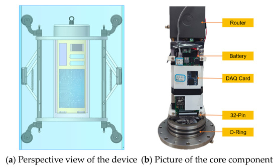 The core component of the detector is a sealed inner cylinder, as shown in Figure 4, which is equipped with batteries, a data acquisition card, a router, and a wireless switch, among other vital components, forming the detector’s data collection and control center. The power and signal cables of the sensors are safely encapsulated with epoxy resin and connected to the inner cylinder cover via special waterproof pins. This design ensures a stable power supply to the sensors and facilitates communication with the data acquisition card. The data acquisition card performs exceptionally, with a maximum sampling rate of 2000 Hz per channel and up to 32 available channels. The collected signals can be transmitted in real time via a wireless network or temporarily stored on a USB device for subsequent analysis. Additionally, the top cover of the inner cylinder uses an O-ring locking design capable of withstanding up to 30 MPa of water pressure, fully meeting the stringent requirements of in-service riser inspection.