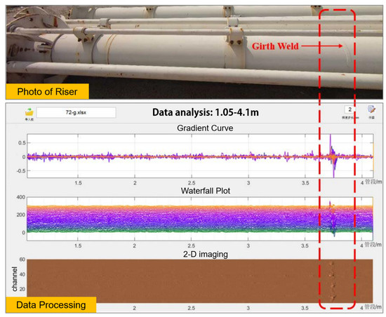 As depicted in Figure 8, the two-dimensional gradient image presented below provides a clear visualization of a continuous ‘pit’ located approximately 4 m from the terminus of the marine riser. At this particular locale, notable fluctuations were observed in the gradient data obtained from all 60 sensors. It is worth noting that each riser is equipped with a girth weld positioned at a distance of 4 m from its pin end, which is intuitively illustrated in the accompanying photograph of the riser. This indicates that the magnetic memory testing method can effectively detect girth welds in risers.