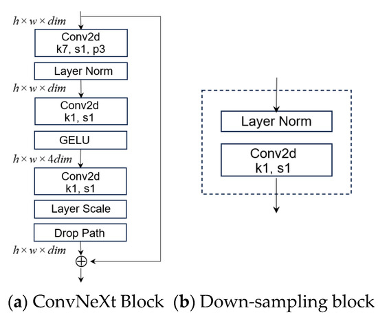 ConvNeXt innovatively adopts the GELU activation function, replacing the traditional ReLU, and reduces the usage of activation functions and regularization layers, thereby decreasing computational load. Inspired by the Transformer model, it substitutes batch normalization (BN) with layer normalization (LN), ensuring that the model remains stable during training across different batch sizes and enhancing its generalization ability. Furthermore, ConvNeXt separates the down-sampling from the bottleneck in ResNet, employing a dedicated down-sampling layer. This design facilitates a stable training process and improves the model’s generalization ability. The specific details are presented in Figure 9.