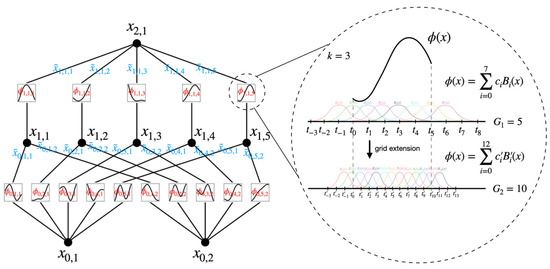 The Kolmogorov–Arnold Network (KAN) is a neural network architecture deeply inspired by the Kolmogorov–Arnold Representation Theorem [33]. This theorem indicates that any multivariate continuous function can be expressed as a composition of a finite number of univariate continuous functions. Based on this principle, KANs approximate multivariate functions through a two- or multi-layer network structure, thereby enhancing the accuracy and interpretability of the network. The formula is shown in Equation (2).