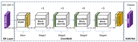 As shown in Figure 12, the network proposed in this study is based on the ConvNeXt model, with the innovative integration of the SK (Selective Kernel) attention module in its initial input layer. This module can adaptively select different scale convolution kernels to extract and utilize critical information in images more effectively. By applying the SK Attention mechanism, the model can capture multi-scale features in the early stages of image processing, which facilitates a more comprehensive understanding of the input image content. Furthermore, the traditional Linear Layer in the network’s last layer is replaced with the KAN as the classification layer. Considering the KAN’s learning activation function and flexible representation, it is expected to achieve more precise and robust image classification results.