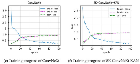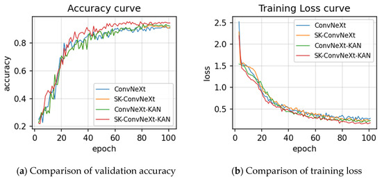As shown in Figure 15, introducing the SK attention and KAN modules reduced the training loss of the ConvNeXt network and further enhanced its accuracy. When these two modules were seamlessly integrated into the ConvNeXt network, resulting in the SK-ConvNeXt-KAN model proposed in this study, their synergistic effects at the input and output layers remarkably bolstered the model’s classification performance. Figure 15a depicts that the SK-ConvNeXt-KAN model distinctly surpassed the other models, achieving a consistently higher classification accuracy from 20 training iterations.