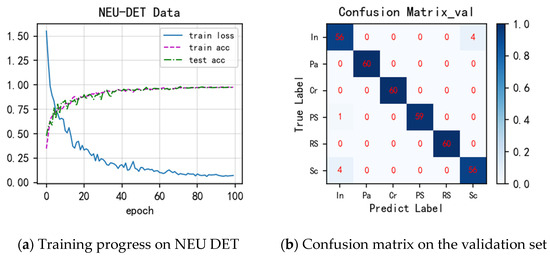 The NEU DET dataset contains images with a resolution of 300 × 300 pixels, spanning six categories, with the specific number of images per category and detailed descriptions outlined in Table 8. To train and test the SK-ConvNeXt-KAN model proposed in this paper using the NEU DET dataset, we resized the input images to 224 × 224 pixels and modified the output layer to include six categories corresponding to the six types of defects present in the dataset. Additionally, we preserved the model’s original architecture and hyperparameter settings to ensure the validation process’s fairness and accuracy. As depicted in Figure 18a, the model showcased excellent learning efficiency throughout the training process, with a consistent decrease in training loss and a concurrent increase in accuracy on both the training and validation sets. The model stabilized after approximately 80 iterations. At the end of the training period, the accuracy of the training set reached 97.71%, while an even higher accuracy of 97.5% was achieved on the validation set. Moreover, the training loss was significantly reduced to 0.071, illustrating the model’s robust fit to the data.