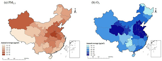 Annual average PM2.5 (a) and O3 (b) concentrations in China in 2019.