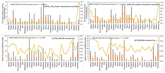 A study analysing the health effects of PM2.5 and O3 pollution was conducted in 31 provinces and cities. The number of all-cause premature deaths aggregated at the provincial spatial level was analysed to determine the number of all-cause premature deaths attributable to PM2.5 and O3 pollution in 2019 and the proportion of total deaths in that year in each province and city. Based on the number of premature deaths caused by PM2.5 and O3 pollution, the health and economic losses caused by PM2.5 and O3 pollution exposure in 2019 could be obtained, as shown in Figure 2.