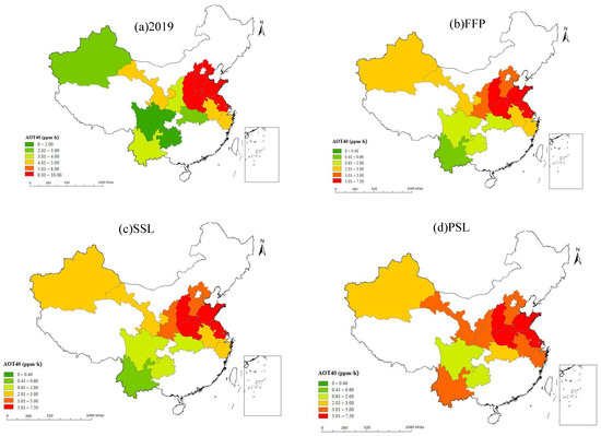 As can be seen from the table, the health economic losses caused by PM2.5 and O3 pollution increased in all three scenarios compared to 2019, except for the PSL scenario. In the PSL scenario, the number of premature deaths decreased across all scenarios, while the value of statistical life (VSL) increased because of various factors, such as subjective perceptions of the population, gender, education, and economic level, which continued to change over time. Therefore, the impact of the policy scenario on the economic loss of health compared to the baseline scenario is discussed. Compared to the baseline scenario, all three scenarios effectively reduced health economic losses caused by PM2.5 and O3 pollution. The PSL scenario exhibited the largest reduction, followed by the FFP scenario, whereas the SSL scenario did not differ significantly from the baseline scenario.