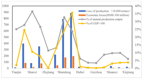 Winter wheat production and economic losses by province and municipality in 2019 are shown in Figure 4.