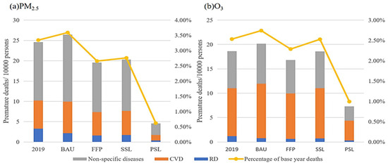 Based on the target levels of pollutants set for the different scenarios, combined with the projected and baseline mortality rates for each province and city, the number of premature deaths attributable to PM2.5 and O3 pollution for the different scenarios in the target years can be calculated as shown in Figure 5.