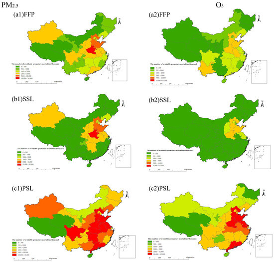 Distribution of avoidable premature deaths attributed to PM2.5 and O3 pollution under different scenarios (FFP, SSL and PSL) in China in 2025.