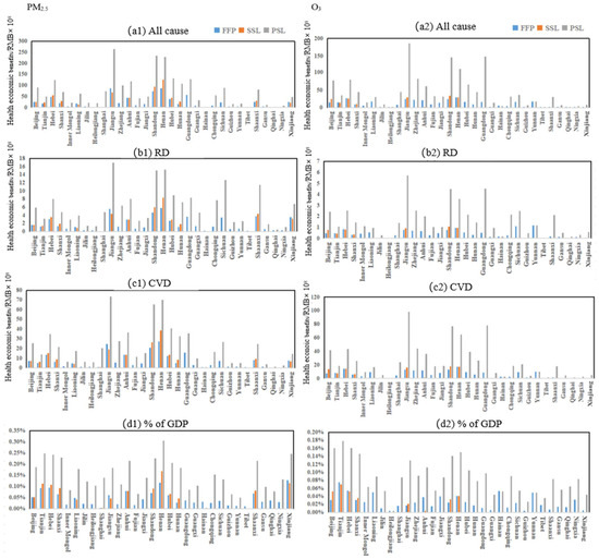 The realisable economic benefits of PM2.5 pollution improvement under the PSL scenario were RMB 229.268 billion. Jiangsu Province had the most realisable economic benefits, at RMB 26.303 billion, accounting for 18.25% of GDP. The realisable economic benefits of improving O3 pollution improvement were RMB 14.227 billion, of which RMB 77.924 billion and RMB 5.094 billion were for cardiovascular and respiratory diseases, respectively. This shows that the implementation of the Tier 1 area standard concentration for the exceeding provinces and cities can achieve a great deal of health economic benefits from circumventing premature deaths caused by PM2.5 and O3 pollution, with Jiangsu Province and Guangdong Province having the most realisable economic benefits but not a high percentage of GDP.