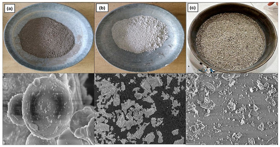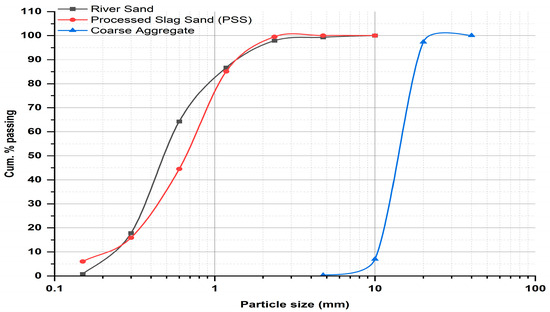 This research investigation was employed. Ultrafine class F fly ash (FA), ground granulated blast furnace slag (GGBS), 10 molar sodium hydroxide solution (SHS), sodium silicate solution (SSS), river sand (RSa), processed slag sand (PSS), coarse aggregate (CAg), and water are the constituents used to prepare the PQGC. These materials were locally sourced to reduce the cost of production. FA with a ceno-spherical particle shape in its morphology (Figure 1a) was obtained from the Udupi Thermal Power Plant. GGBS was procured from Mangalore. NaOH pellets and Na2SiO3 solutions were also purchased from a supplier in Mangalore. CAg, RSa, and PSS were obtained from local traders. All these materials were tested for their physical properties per the relevant codes to meet the requirements of paving materials, as presented in Table 1 [9]. Figure 1a–c depicts the physical appearance of FA, GGBS, and PSS, along with their microimages. It was found that the particles of GGBS (Figure 1b) and PSS (Figure 1c) were primarily irregular and blunt in shape. Figure 2 [9] shows the resemblance in the particle size distribution curve of PSS and RS. Table 2 [9] presents the composition of various oxides in FA, GGBS, and PSS.