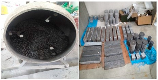 The mixing of raw materials was performed in a drum mixer (Figure 3). The fly ash and GGBS were first added to the mixer and thoroughly mixed to begin the blending process. To this, RSa and/or PSS, along with the CAg, were added, and the mixing continued for 5 mins. An adequate quantity of water was added at this stage, and mixing continued for 2 min. Lastly, the NaOH and Na2SiO3 solutions, which were kept combined before 2 h of the mixing process, were added to the mixer. The mixing continued for another 3 min until a homogeneous mixture was obtained. The 10 -molar SHS was prepared one day before the day of mixing by dissolving 420 gm of NaOH pellets in 1000 mL of water. The prepared homogenous mixture in its fresh state was then transferred to molds of the designated shape, and the fresh concrete in the molds was allowed to set for 24 h. After the concrete sets, it is removed for the molds and allowed for ambient curing for 28 days, as depicted in Figure 3.