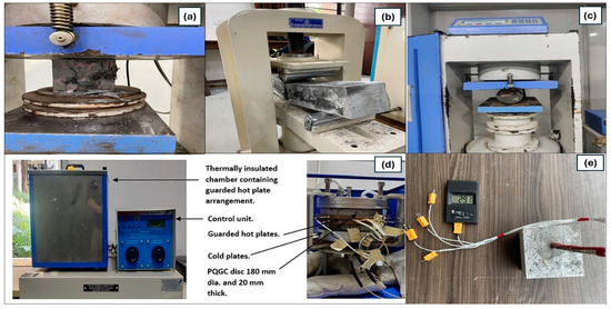 Measurement of thermal conductivity and surface temperature: The thermal conductivity of the PQGC specimens was measured using a guarded hot plate (GHP) instrument, as shown in Figure 4d. The instrument consists of a hot plate with a central heater, surrounded by a guard heater, and a cold plate. The PQGC circular disc is positioned between the hot and cold plates. Conduction sends heat through the PQGC disc from the hot plate to the cold plate. The thermal conductivity values are determined by adjusting the power supplied to the central and guard heaters while varying the temperature. The instrument automatically calculates and displays thermal conductivity based on the power supplied and the temperature.
