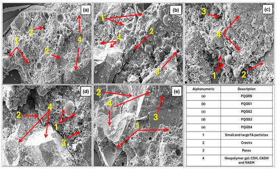 The effect of RSa replacement by PSS on microstructure properties was performed by analyzing the SEM images at a magnification of 1000×. The pore refinement and geopolymer gel formation improved as PSS replaced RSa from 25% to 100%. The increase in PSS content provides additional Ca2+ ions during the geopolymerization reaction, as reported in [9]. Therefore, it improves the synthesis of unreacted FA and GGBS particles. Figure 5 depicts the micrographs of PQGRS and PQGSx mixes. Figure 5a is for the PQGRS mix containing only RSa. It contained many large and small, non-synthesised FA particles. The cracks are evident in large FA non-synthesised particles. The geopolymer compounds have significant pores. All these reasons led to reduced strength in the PQGRS mix.