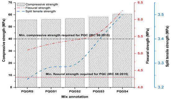 Figure 6 illustrates the mechanical strengths of the PQGRS and PQGSx mixes after 28 days of ambient curing. It is observed that the mechanical strengths increased steadily as the replacement level of RSa by PSS increased from 25% to 100%. The compressive strength test represents a fundamental and widely used examination method for concrete. This test holds significant utility, as many crucial properties of concrete are intricately linked to its compressive strength (Neville, 1995). Compressive strength (Cst) is a metric for measuring paving concrete performance and quality. For rigid pavement applications, the concrete mix should satisfy the minimum compressive strength (MCst) requirement of 40 MPa as per IRC58: 2015 [67].