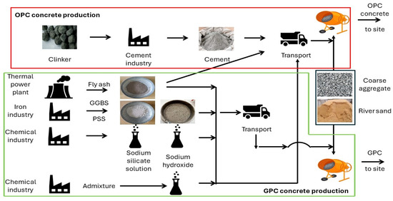 Ordinary Portland Cement (OPC) concrete plays a pivotal role as an indispensable material, exerting a substantial impact on the development of the built environment [1]. However, the widespread use of OPC concrete has raised environmental concerns, particularly in the context of greenhouse gas (GHG) emissions. OPC, a key component of traditional concrete, is associated with substantial carbon dioxide (CO2) emissions throughout its life cycle, contributing to the overall carbon footprint of the construction industry. OPC production is energy-intensive, notably due to the calcination of limestone and the high-temperature (900 to 1500 °C) clinker production, resulting in a substantial release of CO2 into the atmosphere, ranging from 0.8 to 1.0 metric tons for every 1.0 metric tons of cement production [2,3]. These emissions have far-reaching implications, as OPC is estimated to be responsible for approximately 5% of global anthropogenic CO2 emissions [4,5] and constitutes a notable share of the total energy consumption within the industrial sector. In pursuing sustainable development and reducing the construction carbon footprint, the researcher’s interest has gradually turned toward investigating blended cement and other novel alternatives. Blended cement [6,7] is one in which OPC is partially replaced with secondary cementitious materials (SCM), such as fly ash, slag, and silica fume, reducing CO2 emissions by approximately 12–22% [2]. Alternatively, geopolymer concrete (GPC) or alkali-activated concrete (AAC) is emerging as a pivotal innovative construction material that can significantly shift towards a circular economy. These cements are eco-friendly, as the reduction in CO2 emissions compared to OPC is estimated at 80% [2,5].