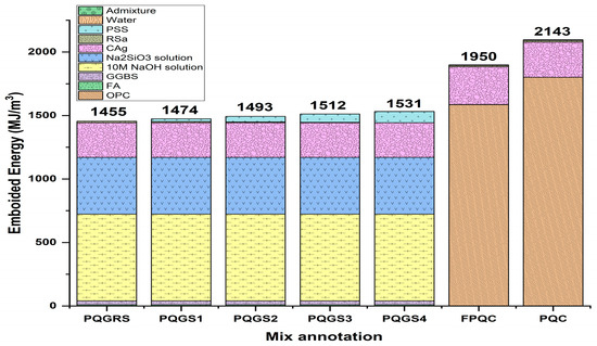 The parameters that are considered for the assessment of energy consumption in the production of one cubic meter of PQGC and PQC mixes encompass various system variables, namely OPC, FA, GGBS, alkali solution, aggregates, PSS, admixture, and water. OPC, produced through the heat treatment of clinker in kilns, demands approximately 4.2 MJ to 4.8 MJ per kilogram of its production [2,10,73]. FA, a by-product of coal combustion in thermal power plants, has almost negligible energy consumption. However, it undergoes processing before integration into construction, warranting a conservative EE estimate of 0.04 MJ/kg. GGBS, derived from the grinding of slag, a by-product of the iron manufacturing industry, possesses an embodied energy of 0.31 MJ/kg. Alkaline solutions, constituting a substantial portion of the energy in GPC, incur energy of 20.5 MJ/kg for NaOH [10] and 5.37 MJ/kg for Na2SiO3 [10,73,74]. Aggregates constitute 70% to 75% of concrete volume, with CAg and RSa having energy values of 0.22 MJ/kg and 0.02 MJ/kg, respectively [10]. PSS, another by-product of iron manufacturing derived from slag processing, incurs an energy consumption of 0.15 MJ/kg (assumed to be 50% of the energy consumption of GGBS as the information on energy consumption for the production of PSS was unavailable in the database). The values of embodied energy of constituent materials of all the concrete types considered in this study are presented in Table 5. The estimated embodied energy values for one cubic meter of PQGRS, PQGSx, PQC, and PQC with fly ash (FPQC) are compared in Figure 8.