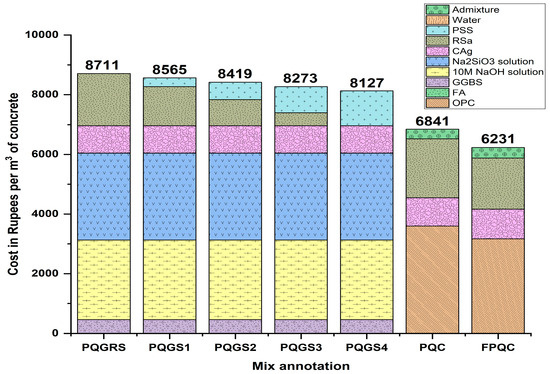 The unit costs of the constituent materials of PQGC, PQC, and FPQC are given in Table 7, while the estimated costs per cubic meter (m3) of PQGC, PQC, and FPQC are shown in Figure 10. The cost associated with PQGC may exhibit variability contingent upon the retail pricing of NaOH and Na2SiO3 solutions utilized in preparing the alkaline solution for PQGC production [81]. Since FA and GGBS are readily available industrial by-products, their costs are reasonable, depending on proximity to the source of availability. Meanwhile, the cost distribution related to aggregates remains consistent.