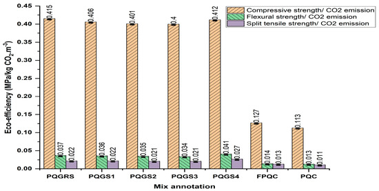 Split tensile strength/CO2 emission: Ecoefficiency, when measured w.r.t split tensile strength, depicts similar trends as that of ecoefficiency measured for flexural strength. The eco-efficacy measured with split tensile strength for PQGRS, PQGS1, and PQGS3 is around 0.021–0.022 MPa/KgCO2 m3. The eco-efficacy measured at split tensile strength for PQGS4 is again slightly higher at 0.027 MPa/KgCO2 m3. The spit tensile eco-efficacy values for FPQC and PQC are the lowest at 0.11–0.013 MPa/KgCO2 m3.