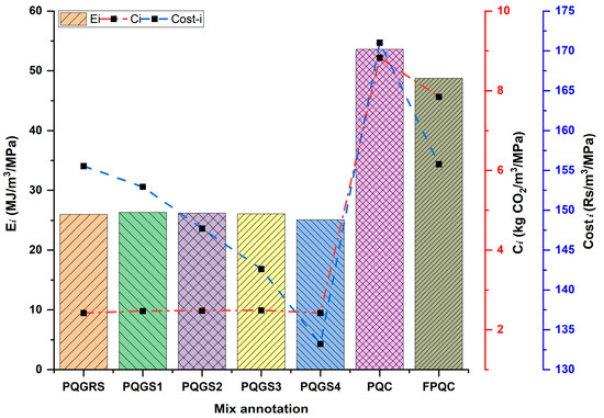 Cost index: PQGS4 offers the lowest cost per unit strength, while PQC, despite its high energy and carbon intensity, also has very low-cost efficiency. The trend suggests lower costs do not always align with better environmental performance.