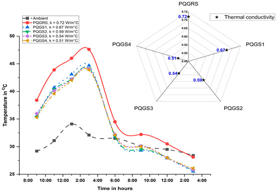 K -type thermocouples were embedded inside the PQGC cubes in order to measure the temperature variations at the near -top surface w.r.t. fluctuations in the ambient temperature, as shown in Figure 4e. The cubes were kept outside to receive sufficient sunlight during the day. The free end of the thermocouple wire, which contains pins, was connected to a hand -held data logger that converts electrical signals received from the thermocouple to temperature and displays them. The temperature was recorded manually at regular intervals for 7 days. The observed temperature data was analyzed to understand the temperature distribution pattern in PQGC cubes.