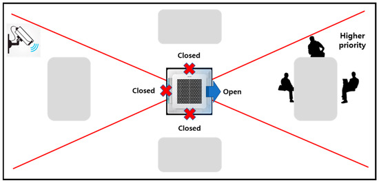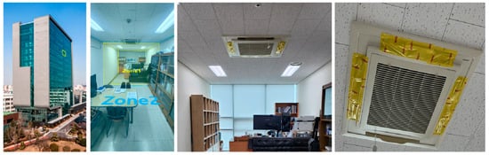 Preliminary experiments were conducted to validate the feasibility of the individual control of a four-way air conditioner in a single zone. The target zone was an individual office space (26.4 m2) on the 11th floor of a campus building conditioned using a four-way air conditioner that was installed on the ceiling (Figure 4). The single open space was divided into two zones (Zones 1 and 2) without partitions. The experiment was conducted using four temperature sensors installed in two zones (at a desk height of 0.6 m) and two supply diffusers, as shown in Figure 4. The four-directional blades of the existing air-conditioning system were sealed with tape (retrotec). This sealing tape is one of the decent products used for typical research and practice for the building infiltration domain such as blower doors test. During the control periods for Zones 1 and 2, only the blade in the corresponding direction was opened for measurements.