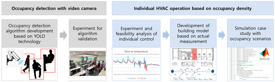 Figure 2 depicts the methodology used in this study. First, object recognition technology was used to estimate the distribution of occupants in open spaces. An algorithm was developed using YOLOv5 object recognition technology to detect the presence of indoor occupants and locate spaces within a partitioned area with the highest number of people. The presence or absence of occupants was determined, and priority control zones were designated. Second, the energy-saving potential and efficiency were quantified for individualized control within spaces. The experiment was conducted in a single open space (26.4 m2) divided into two subzones, where the four-way ceiling air conditioner was installed. This was achieved by providing cooling to each zone in turns. A grey-box building model was established based on the experimental data, and a simulation case study was conducted with an occupancy schedule to demonstrate occupancy-based prioritized-zone control.