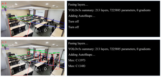 This algorithm was demonstrated through real-time experiments. The classroom was set up with a camera connected to a laptop. Six occupants entered the classroom and moved, whereas YOLOv5 identified the number of occupants (the red rectangles in Figure 3) in each zone and exported the zone with the maximum number of occupants. The “turn off” was returned when the zone was unoccupied, which indicated that the air conditioner turned off.