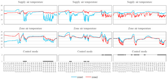 Feasibility experiment results with supply air and zone air temperature with control mode (17–18 May 2023 (left), 24–26 May 2023 (center), and 30 May–2 June 2023 (right)).