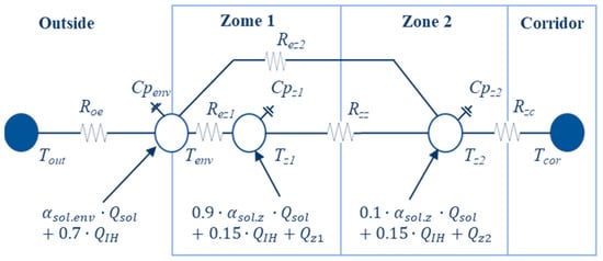 The grey-box model consisted of three states for the envelope, zone 1 air and zone 2 air, as shown in Figure 6. The heat balance equations for each state are expressed by Equations (1)–(3), as follows: