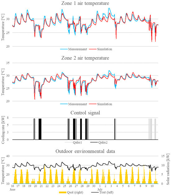The modeling results are shown in Figure 7. The zone temperature comparison between the measurement and simulation with control signal (cooling rate) and disturbance inputs (solar radiation and outdoor air temperature) are illustrated. The RMSE of the two zone temperatures were 0.89 and 0.90 °C, respectively. No guidelines are available for evaluating the prediction performance of the grey-box model; however, this error range is acceptable for evaluating the simulation case, as some previous studies obtained values of 0.5–1.0 °C and utilized for actual implementation in real buildings [29,30].