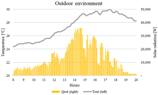 The scenarios were applied to building energy simulations using a grey-box model in a Matlab environment. The two thermal zones were conditioned using feedback control strategies. This study applied only the P gain in the control loop with a time step of 1 min. As the discretized building model had a time step of 1 min, real-time feedback control, as implemented in actual buildings, was unavailable. The setpoint temperature of the conditioned zone was set to 23.5 °C. The initial temperatures of all the states (two air temperatures and envelope temperature) were set to 23 °C. The outdoor air temperature and solar radiation from the actual measured data in 2021 summer (August 14th) were used, as shown in Figure 8.