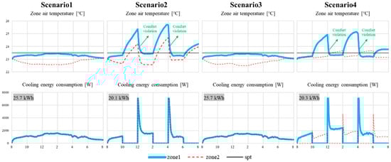 Figure 9 shows the temperature trajectories and cooling rates for all scenarios. In Scenario 1, the air temperatures in the two zones were maintained under the setpoint, and cooling was provided for the entire period (8 am–8 pm), regardless of occupancy. In Scenario 2, the air conditioner was put on only during the occupied period. The energy consumption in Scenarios 2 was 20.1 kWh whereas that of Scenario 1 was 25.7 kWh. The savings potential of this occupancy-based on/off control was approximately 22%. In Scenario 3, the air temperatures in the two zones were maintained under the setpoint, and cooling was provided for the entire period (8 am–8 pm), regardless of occupancy. In Scenario 4, the air conditioner was put on only during the occupied period. The energy consumption of Scenario 4 was 20.3 kWh, whereas that of Scenario 3 was 25.7 kWh. The savings potential of this occupancy-based zone control was approximately 21%, similar to the previous comparison between Scenarios 1 and 2. When half of the entire area was occupied (Scenarios 1 and 3), the savings potential compared with the global zone control was approximately 21–22%. This could have been 50% if the two zones were fully separated by an internal wall. This limited percentage in savings is attributed to convective air movement between the two zones, which is inevitable in open spaces. However, this range (21–22%) is not marginal and implies the feasibility of energy savings with occupancy-based control.