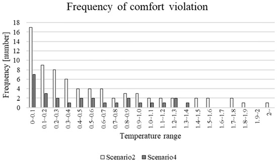 In Scenarios 2 and 4, comfort violations were observed when conditioning was started in one zone, as indicated in Figure 9. Figure 10 shows the frequency distributions of this violation for Scenarios 2 and 4. The vertical axis represents the number of violations calculated for 1 min. Approximately, a quarter of the total violations was smaller than 0.1 °C for both scenarios (23% and 26% for Scenarios 2 and 4, respectively). The corresponding portions of violations lower than 0.5 °C for both scenarios were 59% and 56%. The violations higher than 1 °C were 19% for both scenarios. The maximum violation was 2.1 °C for Scenario 2, but only for one count, which indicated that this occurred only for 1 min. Moreover, for all periods, the temperature was in the comfort bound of ISO 7730 (less than 25.5 °C in class A, which is the strictest case) [35,36]. When evaluated with ASHRAE standard 55, the temperature was also in comfort bound [37] assuming the air temperature is identical to operative temperature.