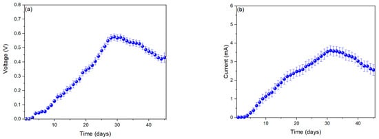 The data presented in Figure 3a show the voltage data over time. Voltage started at 0.039 ± 0.001 V on day 4 and peaked at 0.572 ± 0.024 V on day 31 before gradually decreasing to 0.431 ± 0.032 V by day 45. The initial voltage increase is mainly attributed to oxidation reactions in the anodic chamber and reduction in the cathodic chamber. As Zhao et al. (2019) explain, these reactions create a potential difference that peaks as the chemical compounds are used up, resulting in a decrease in voltage. In similar systems, peak voltages of 0.38 V can be achieved, with the redox potential attributed to the crucial activity of fungal redox enzymes, such as laccase (enzymes), which oxidize aromatic phenolic compounds and amines, and play a significant role in the process, impressively contributing to the generation of peak voltages [32]. Other study also revealed that the fungus Irpex lacteus can reach peaks of 0.35 V, highlighting the superior redox potential of fungal laccase compared to bacterial laccase. Furthermore, Aspergillus, a filamentous fungus, shows significant biotechnological potential for the industrial production of chemical products [33]. Monitoring of the electric current showed that the values increased from day 4 (0.105 ± 0.084 mA) progressively until day 31 with a maximum value of 3.608 ± 0.249 mA, and then decreased in the current values until day 45 (2.562 ± 0.291 mA). The electric current values are caused by the release of electrons by the fungus Aspergillus sp. These electrons are captured by the anodic electrode and transported to the cathode. The delay in the increase in current values for four days is due to the acclimatization time of the fungus and the formation of the mediating biofilm. The fungus Psathyrella candolleana is used as a substrate in the MFC, and the generated electrons come from the organic content of the native microflora. This microflora is responsible for transferring the electrons to the surface of the electrode, leading to an increase in current values in the initial days. At the same time, the COD is reduced due to the activity of the microflora. Thulasinathan et al. (2024) used the fungus T. harzianum and a biodegradable crystal violet, mentioning that the ability to biodegrade some substances depends on each fungus and its compatibility [34]. It is crucial to note that electron production and energy generation are not always directly proportional. They depend on the resistance of the MFCs, a complex system that plays a significant role in their operation [35].
