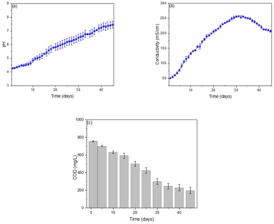 Parameters shown for (a) pH, (b) conductivity, and (c) COD.