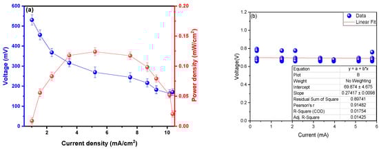 On day 31, the maximum power density values observed were 0.124 ± 0.006 mW/cm2 at a current density of 5.201 mA/cm2 with a voltage of 530.619 ± 25.155 mV (refer to Figure 5a). According to Andirukonis et al. (2021), one crucial factor for achieving good power density results is the adhesion of microorganisms on the surface of the anodic electrode, as it plays a vital role in electron transfer [43]. Also, the literature has reported that the designs used in MFCs are influential in the power density efficiency and that marine sludge has excellent potential as a biocatalyst [44]. Rhizobium anhuiense bacteria has been used as a substrate in MFC, achieving power density peaks of 4.93 mW/cm2, where the authors mention that redox mediators in the proton exchange membrane influence the power density results [45]. Žalnėravičius et al. (2022) also used Rhizobium anhuiense bacteria as a substrate in MFCs, generating a power density of 4.93 mW/cm2 when operating at pH 7, and observed that by introducing glucose, the power density values improved significantly [46]. Figure 5b shows the internal resistance calculated using Ohm’s Law, achieving an internal resistance of 27.417 ± 9.810 Ω on day 31. In their research, Islam et al. (2020) emphasized the collaborative nature of understanding the internal resistance of MFCs, where the resistance is influenced by the biofilm formed and has adhered to the anodic electrode and the synergism between the microorganisms in the substrate [47]. Considering various factors such as the MFCs’ geometry, the electrodes’ structure, the substrate used, and the diffusion rate of protons and electrons is crucial for this collaborative effort [48]. Bhatt et al. (2024) contributed to this collective knowledge by using the fungus Aspergillus niger in their research. They demonstrated how variations in resistance values can impact power density. Additionally, they noted that high resistance values can impede electron flow, thereby reducing the electric current of the MFCs [49].